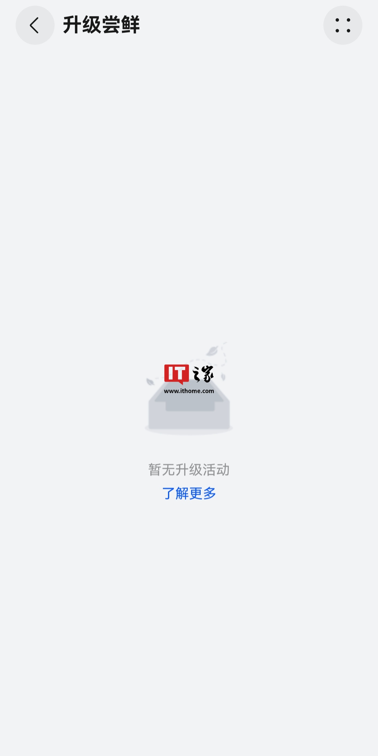 IT之家实测发现,更新该补丁包后的机型会在系统更新右上角的「: :」新增“升级尝鲜”选项(当今该选项的功能页面暂无臆想看成)。